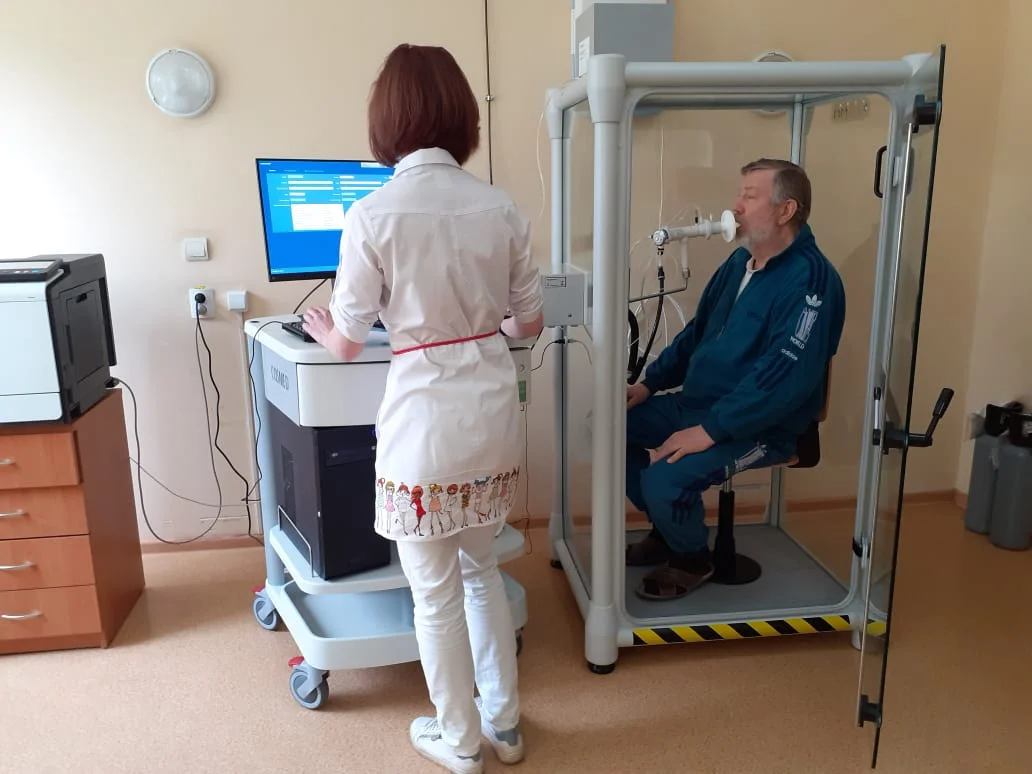 В начале этого года в больнице появился уникальный для региона аппарат – бодиплетизмограф стоимостью 5,6 миллиона рублей, который сейчас запущен в тестовом режиме. Комплексное оборудование предназначено для исследования функций внешнего дыхания человека, то есть возможностей легких пациента и их способности к расширению, а также газообмена. При этом аппарат позволяет определять более точные и детализированные показатели, чем на другом подобном оборудовании. Поэтому после выхода на полноценный режим его будут очень активно использовать в том числе при работе с больными коронавирусом.